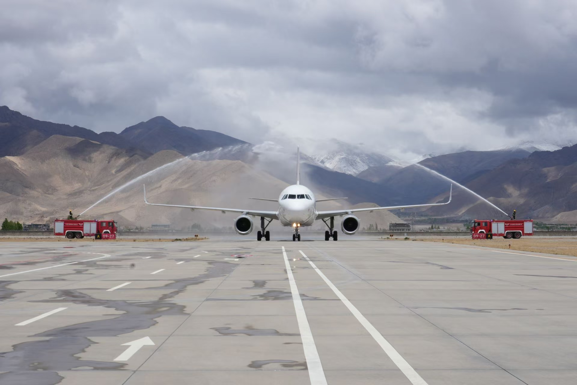 2025年5月1日,中國東航開通首條上海直飛日喀則的航線,該航線成為西藏支線機場連接上海的第一條直達空中通道,圖為日喀則機場以“水門儀式”迎接首航航班。