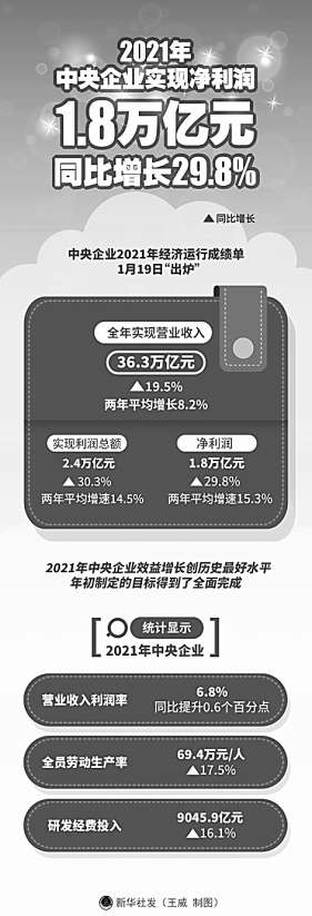 數(shù)據(jù)顯示,2021年,中央企業(yè)實(shí)現(xiàn)營業(yè)收入36.3萬億元,同比增長19.5%;實(shí)現(xiàn)利潤總額2.4萬億元,同比增長30.3%;實(shí)現(xiàn)凈利潤1.8萬億元,同比增長29.8%,均創(chuàng)歷史最好水平。中央企業(yè)全員勞動生產(chǎn)率人均達(dá)到69.4萬元,同比增長17.5%;百元營業(yè)收入支付的成本費(fèi)用為94元,同比下降0.9元;年末資產(chǎn)負(fù)債率為64.9%,圓滿完成控制在65%以下的目標(biāo)。