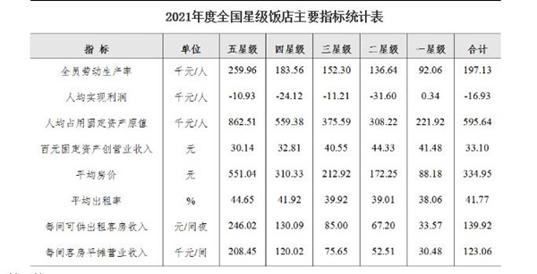 根據(jù)“2021年度全國星級飯店主要指標統(tǒng)計表 ”,平均房價為334.95元,每間可供出租客房收入為139.92元/間夜,每間客房平攤營收為123.06千元/間。