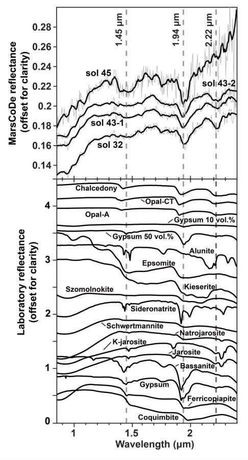 劉洋研究員和合作者通過對祝融號火星表面成分探測器獲取的短波紅外光譜和導航與地形相機數據進行分析,發(fā)現(xiàn)了一種形貌上類似沉積巖的巖石類型——板狀的亮色巖石。這些板狀巖石通常部分被灰塵和土壤覆蓋,顯示出剝落的表面,表明受到熱應力和風成作用的物理風化。研究人員利用短波紅外光譜在這些亮色板狀巖石中探測到了之前軌道數據在該區(qū)域沒有識別到的含水礦物,這些光譜具有~1.9μm和~2.2μm吸收特征,推測其為含水硅或含水硫酸鹽。