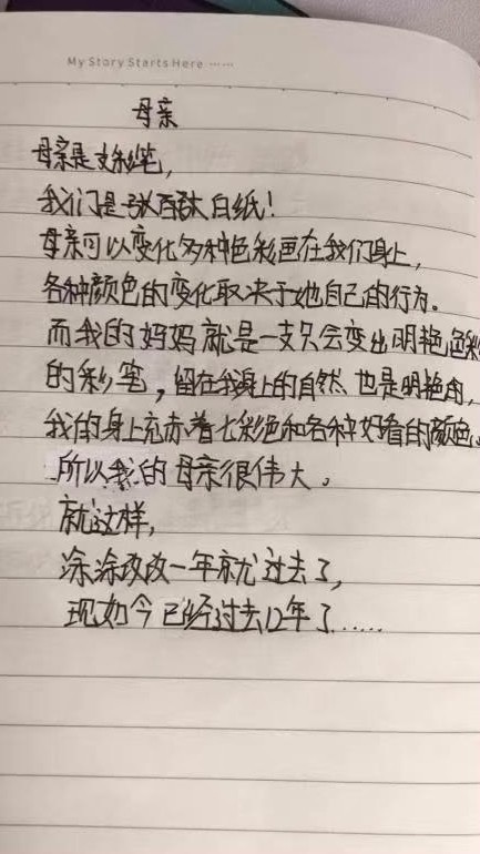 在與孩子們視頻通話時,盛楠收到了一封來自大女兒親筆寫的信:“母親是支彩筆,我們是張白紙。母親可以變化多種色彩畫在我們身上,各種顏色的變化取決于她自己的行為。而我的媽媽就是一支只會變出明艷色彩的彩筆,留在我身上的自然也是明艷的,我的身上充斥著七彩色和各種好看的顏色,所以我的母親很偉大。就這樣,涂涂改改一年就過去了,現(xiàn)如今已經(jīng)過去12年了……”讀到這里盛楠濕潤了眼眶。
