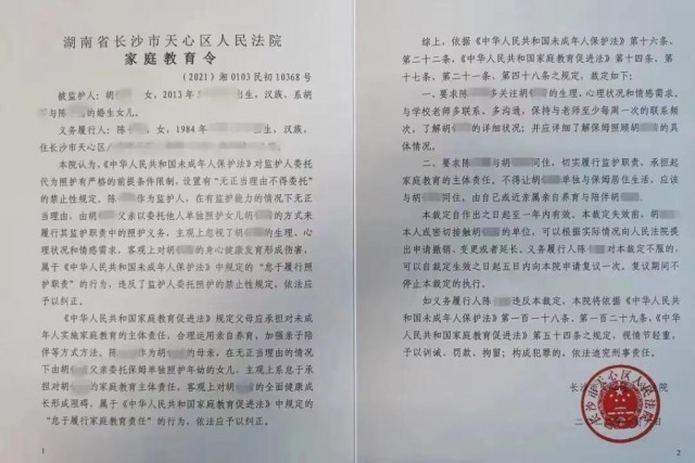 長(zhǎng)沙市天心區(qū)人民法院發(fā)出的家庭教育令。