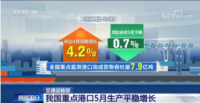 央視網(wǎng)消息:5月26日,交通運(yùn)輸部發(fā)布數(shù)據(jù)顯示,5月以來,全國港口航道保持暢通,主要生產(chǎn)指標(biāo)穩(wěn)定向好。