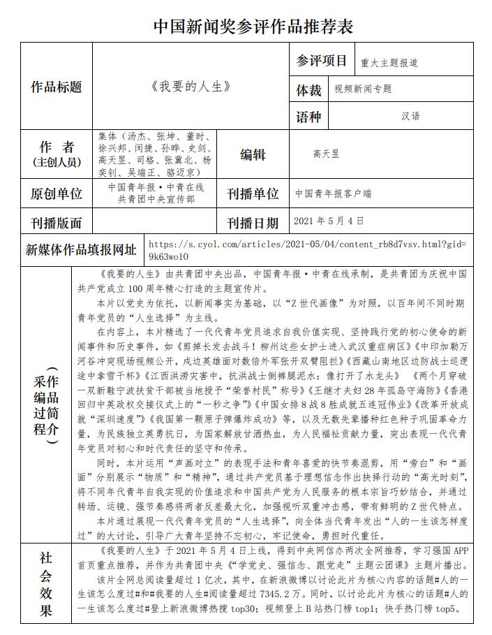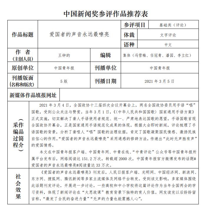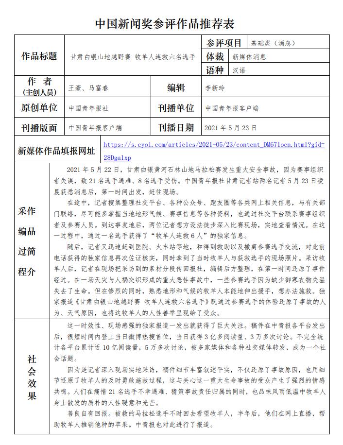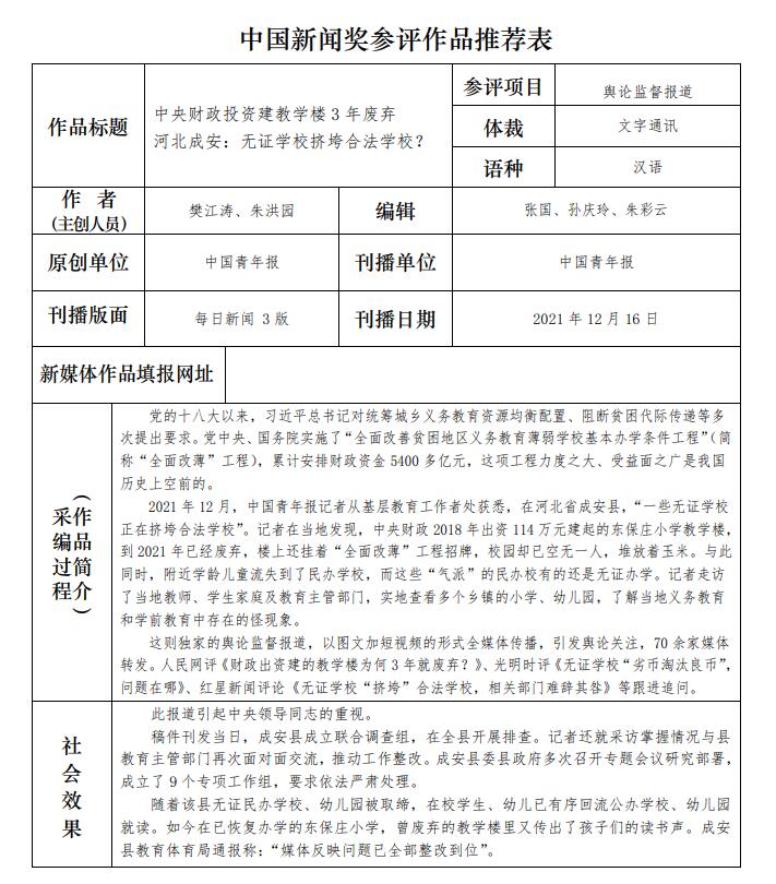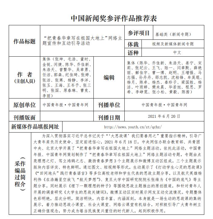 中國青年報社推薦參評第三十二屆中國新聞獎報送作品公示