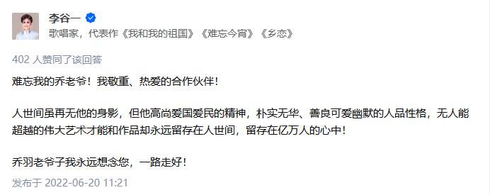李谷一在聽聞喬羽逝世的消息后,第一時間發(fā)文悼念:“難忘我的喬老爺!我敬重、熱愛的合作伙伴!人世間雖再無他的身影,但他高尚愛國愛民的精神,樸實無華、善良可愛幽默的人品性格,無人能超越的偉大藝術(shù)才能和作品卻永遠(yuǎn)留存在人世間,留存在億萬人的心中!喬羽老爺子我永遠(yuǎn)想念您,一路走好!”