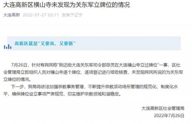 據(jù)大連高新微信公眾號消息, 7月26日,針對有網(wǎng)民稱“我還給大連關(guān)東軍司令部怨靈在大連橫山寺立過牌位”一事,區(qū)社會管理局立即組織人員對橫山寺逐個(gè)牌位、逐項(xiàng)登記進(jìn)行細(xì)致核查,未發(fā)現(xiàn)網(wǎng)民所說的為關(guān)東軍立牌位的情況。