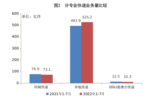 1-7月,全國快遞服務(wù)企業(yè)業(yè)務(wù)量累計(jì)完成608.6億件,同比增長4.3%;業(yè)務(wù)收入累計(jì)完成5880.4億元,同比增長3.7%。其中,同城業(yè)務(wù)量累計(jì)完成73.1億件,同比下降4.9%;異地業(yè)務(wù)量累計(jì)完成525.2億件,同比增長6.3%;國際/港澳臺(tái)業(yè)務(wù)量累計(jì)完成10.3億件,同比下降17.8%。