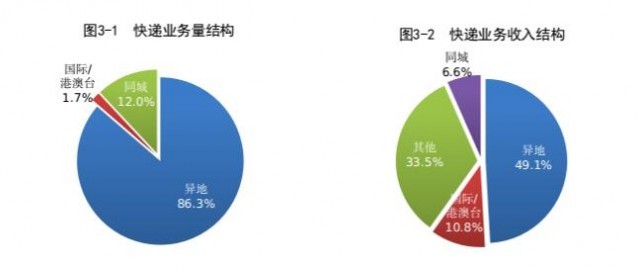 1-7月,同城、異地、國際/港澳臺(tái)快遞業(yè)務(wù)量分別占全部快遞業(yè)務(wù)量的12.0%、86.3%和1.7%;業(yè)務(wù)收入分別占全部快遞業(yè)務(wù)收入的6.6%、49.1%和10.8%。與去年同期相比,同城快遞業(yè)務(wù)量的比重下降1.2個(gè)百分點(diǎn),異地快遞業(yè)務(wù)量的比重上升1.6個(gè)百分點(diǎn),國際/港澳臺(tái)業(yè)務(wù)量的比重下降0.4個(gè)百分點(diǎn)。