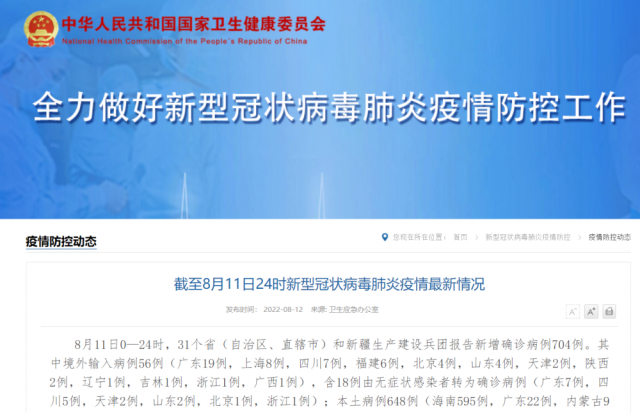 8月11日0—24時(shí),31個(gè)?。ㄗ灾螀^(qū)、直轄市)和新疆生產(chǎn)建設(shè)兵團(tuán)報(bào)告新增確診病例704例。其中境外輸入病例56例(廣東19例,上海8例,四川7例,福建6例,北京4例,山東4例,天津2例,陜西2例,遼寧1例,吉林1例,浙江1例,廣西1例),含18例由無(wú)癥狀感染者轉(zhuǎn)為確診病例(廣東7例,四川5例,天津2例,山東2例,北京1例,浙江1例);本土病例648例(海南595例,廣東22例,內(nèi)蒙古9例,西藏7例,福建5例,上海2例,河南1例,重慶1例,四川1例,貴州1例,云南1例,陜西1例,甘肅1例,新疆1例),含11例由無(wú)癥狀感染者轉(zhuǎn)為確診病例(廣東7例,海南1例,四川1例,貴州1例,新疆1例)。無(wú)新增死亡病例。無(wú)新增疑似病例。