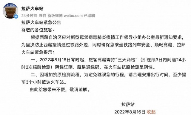 央視網(wǎng)消息:據(jù)@拉薩火車(chē)站 微博消息,根據(jù)西藏自治區(qū)應(yīng)對(duì)新型冠狀病毒肺炎疫情工作領(lǐng)導(dǎo)小組辦公室最新通知要求,為堅(jiān)決防止西藏疫情通過(guò)鐵路外溢,同時(shí)確保您乘坐鐵路列車(chē)安全、順暢離藏,拉薩火車(chē)站緊急提示:8月16日零時(shí)起,旅客離藏需持“三天兩檢”(即連續(xù)3日內(nèi)間隔24小時(shí)2次核酸檢測(cè))陰性證明、藏易通綠碼,在火車(chē)站抗原檢測(cè)呈陰性。因增加抗原檢測(cè)流程,請(qǐng)至少提前3個(gè)小時(shí)抵達(dá)火車(chē)站。