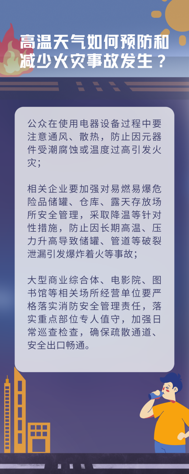 高溫天氣如何有效預(yù)防和減少火災(zāi)事故發(fā)生?應(yīng)急管理部消防救援局發(fā)布消防安全提示,公眾在使用電器設(shè)備過(guò)程中要注意通風(fēng)、散熱,防止因元器件受潮腐蝕或溫度過(guò)高引發(fā)火災(zāi);相關(guān)企業(yè)要加強(qiáng)對(duì)易燃易爆危險(xiǎn)品儲(chǔ)罐、倉(cāng)庫(kù)、露天存放場(chǎng)所安全管理,采取降溫等針對(duì)性措施,防止因長(zhǎng)期高溫、壓力升高導(dǎo)致儲(chǔ)罐、管道等破裂泄漏引發(fā)爆炸著火等事故;大型商業(yè)綜合體、電影院、圖書(shū)館等相關(guān)場(chǎng)所經(jīng)營(yíng)單位要嚴(yán)格落實(shí)消防安全管理責(zé)任,落實(shí)重點(diǎn)部位專人值守,加強(qiáng)日常巡查檢查,確保疏散通道、安全出口暢通。