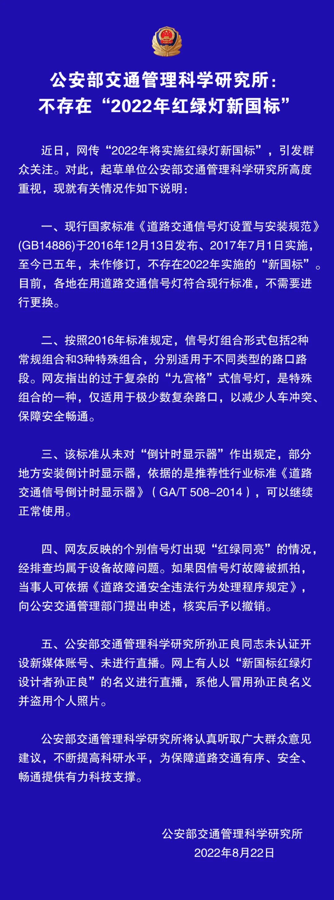 公安部交通管理科學(xué)研究所:不存在“2022年紅綠燈新國(guó)標(biāo)”!