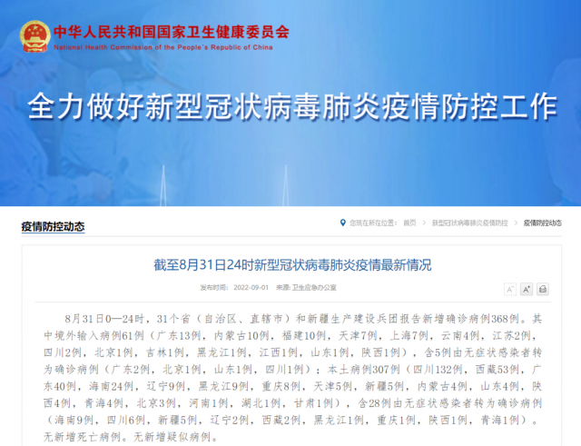 8月31日0—24時,31個?。ㄗ灾螀^(qū)、直轄市)和新疆生產(chǎn)建設兵團報告新增確診病例368例。其中境外輸入病例61例(廣東13例,內(nèi)蒙古10例,福建10例,天津7例,上海7例,云南4例,江蘇2例,四川2例,北京1例,吉林1例,黑龍江1例,江西1例,山東1例,陜西1例),含5例由無癥狀感染者轉(zhuǎn)為確診病例(廣東2例,北京1例,山東1例,四川1例);本土病例307例(四川132例,西藏53例,廣東40例,海南24例,遼寧9例,黑龍江9例,重慶8例,天津5例,新疆5例,內(nèi)蒙古4例,山東4例,陜西4例,青海4例,北京3例,河南1例,湖北1例,甘肅1例),含28例由無癥狀感染者轉(zhuǎn)為確診病例(海南9例,四川6例,新疆5例,遼寧2例,西藏2例,黑龍江1例,重慶1例,陜西1例,青海1例)。無新增死亡病例。無新增疑似病例。