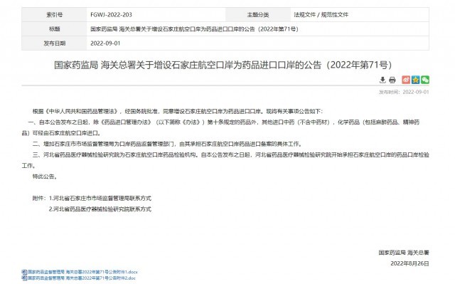 國家藥監(jiān)局、海關總署:增設石家莊航空口岸為藥品進口口岸