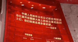△“紀(jì)念中國人民志愿軍抗美援朝出國作戰(zhàn)70周年主題展覽”,紅色玻璃幕墻上鐫刻著抗美援朝英烈模范的姓名。