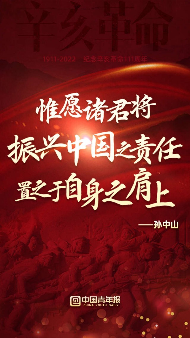 111年前,以孫中山先生為代表的革命黨人發(fā)動了辛亥革命,近代以來中國發(fā)生的深刻社會變革由此拉開新的一幕。今天,讓我們學習和弘揚革命先驅(qū)為振興中華而矢志不渝的崇高精神,為實現(xiàn)中華民族偉大復(fù)興而共同奮斗!