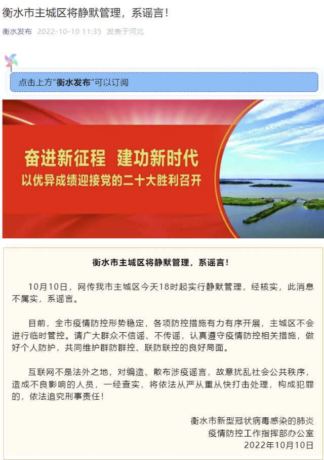 據(jù)“衡水發(fā)布”微信公眾號(hào)消息,衡水市新型冠狀病毒感染的肺炎疫情防控工作指揮部辦公室表示,10月10日,網(wǎng)傳衡水市主城區(qū)今天18時(shí)起實(shí)行靜默管理,經(jīng)核實(shí),此消息不屬實(shí),系謠言。