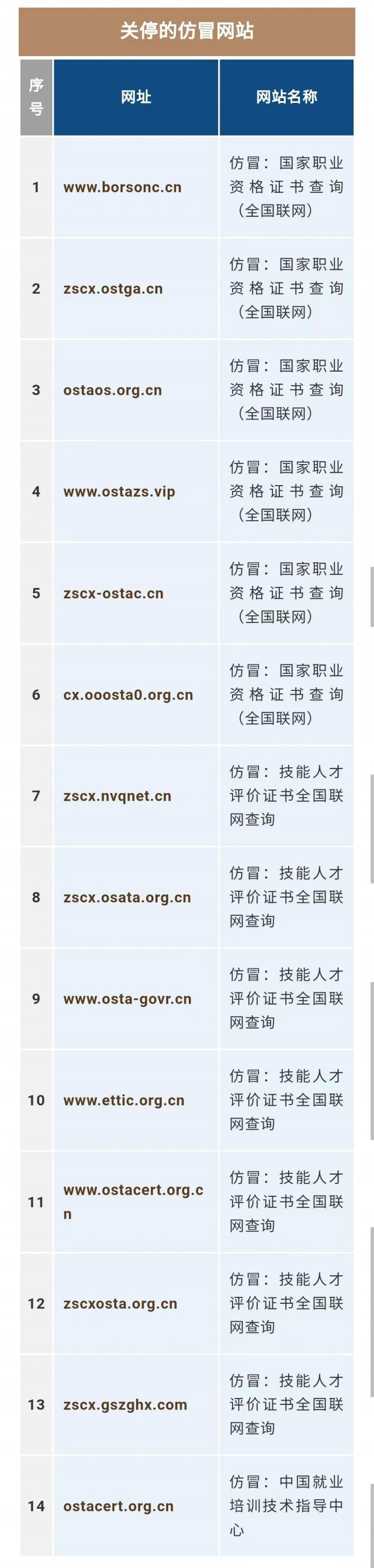 根據(jù)網(wǎng)絡(luò)巡查和群眾舉報(bào)情況,人力資源社會(huì)保障部聯(lián)合有關(guān)部門(mén)查實(shí)并關(guān)停了14個(gè)仿冒網(wǎng)站,其網(wǎng)站名稱、網(wǎng)址及頁(yè)面內(nèi)容與人力資源社會(huì)保障部技能類(lèi)“職業(yè)資格證書(shū)”“職業(yè)技能等級(jí)證書(shū)”(以下簡(jiǎn)稱技能類(lèi)評(píng)價(jià)證書(shū))查詢官方網(wǎng)站高度相似,容易誤導(dǎo)社會(huì)公眾。目前,上述14個(gè)網(wǎng)站均已被關(guān)停。