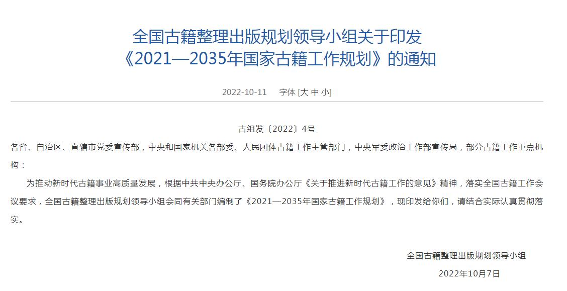 中新網(wǎng)10月12日電 12日,據(jù)國(guó)家新聞出版署網(wǎng)站消息,全國(guó)古籍整理出版規(guī)劃領(lǐng)導(dǎo)小組會(huì)同有關(guān)部門(mén)編制了《2021—2035年國(guó)家古籍工作規(guī)劃》,其中提到,至2035年,古籍工作體制機(jī)制更加完善,以重大工程為引領(lǐng),加強(qiáng)古籍工作全局性謀劃,重點(diǎn)實(shí)施 《永樂(lè)大典》、敦煌文獻(xiàn)系統(tǒng)性保護(hù)整理出版工程等。