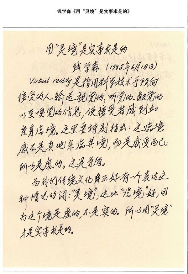 1998年6月18日,87歲的錢學(xué)森寫了一篇短文《用“靈境”是實事求是的》,其中寫道:“我們傳統(tǒng)文化正好有一個表達這種情況的詞‘靈境’;這比‘臨境’好,因為這個境是虛的,不是實的?!?/p>