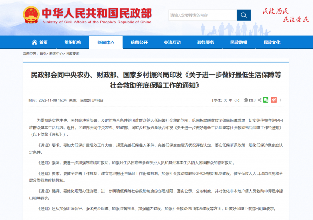 據(jù)民政部網(wǎng)站消息,為貫徹落實黨中央、國務(wù)院決策部署,及時將符合條件的困難群眾納入低保等社會救助范圍,鞏固拓展脫貧攻堅兜底保障成果,切實兜住兜準(zhǔn)兜好困難群眾基本生活底線,近日,民政部會同中央農(nóng)辦、財政部、國家鄉(xiāng)村振興局聯(lián)合印發(fā)《關(guān)于進(jìn)一步做好最低生活保障等社會救助兜底保障工作的通知》(以下簡稱《通知》)。