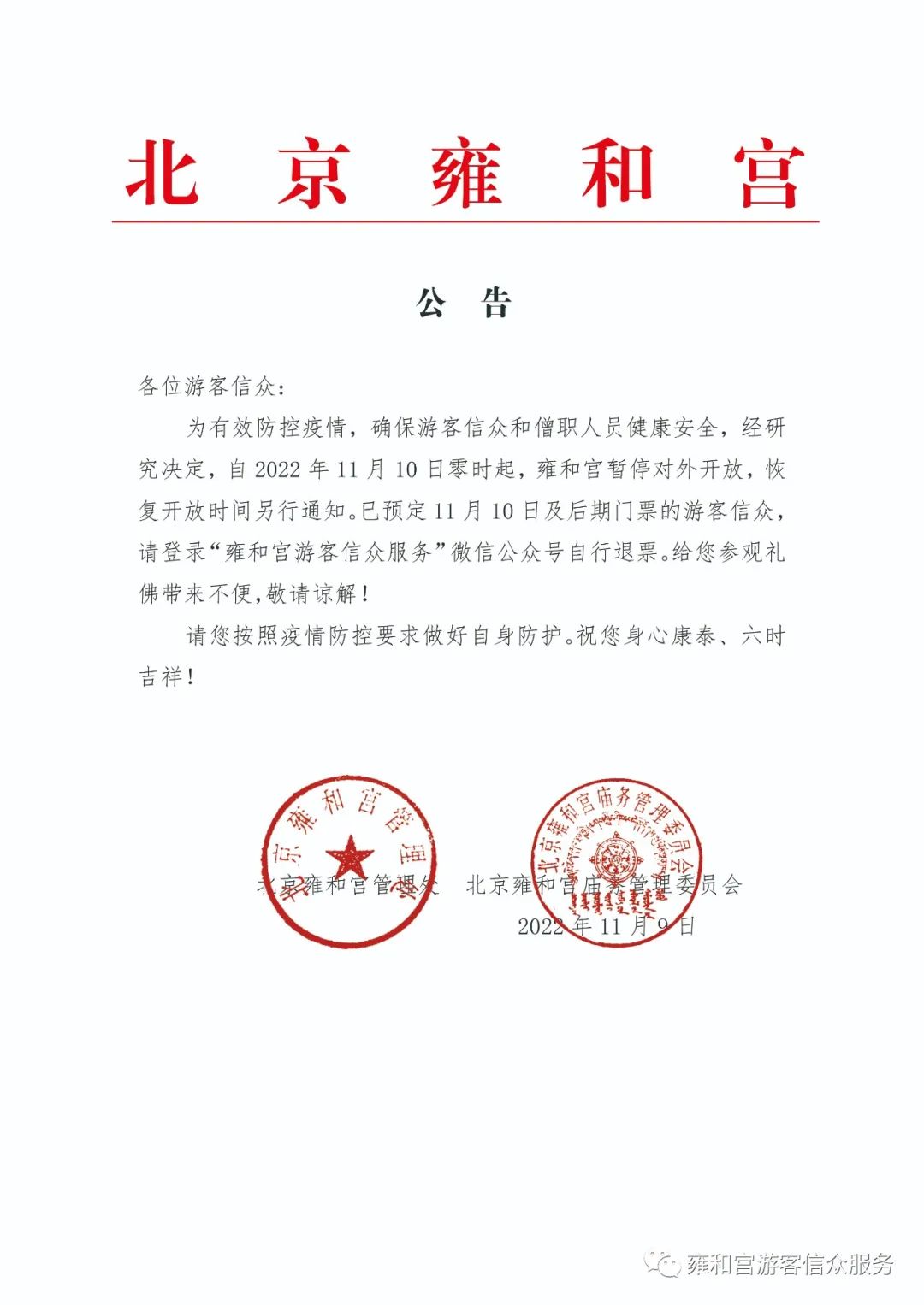 中新網(wǎng)11月9日電 據(jù)雍和宮游客信眾服務(wù)微信公眾號消息,為有效防控疫情,確保游客信眾和僧職人員健康安全,經(jīng)研究決定,自2022年11月10日零時起,雍和宮暫停對外開放,恢復(fù)開放時間另行通知。已預(yù)定11月10日及后期門票的游客信眾,請登錄“雍和宮游客信眾服務(wù)”微信公眾號自行退票。