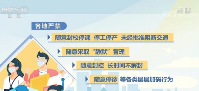 《通知》明確要求,各地嚴(yán)禁隨意封校停課、停工停產(chǎn)、未經(jīng)批準(zhǔn)阻斷交通,隨意采取“靜默”管理,隨意封控、長時間不解封,隨意停診等各類層層加碼行為,加大通報、公開曝光力度,對造成嚴(yán)重后果的依法依規(guī)嚴(yán)肅追責(zé)。對于沒有發(fā)生疫情的地區(qū),要嚴(yán)格按照第九版防控方案確定的范圍對風(fēng)險崗位、重點人員開展核酸檢測,既不能隨意擴(kuò)大核酸檢測范圍,也不能隨意擴(kuò)大人員管控、社區(qū)封控、隔離轉(zhuǎn)運(yùn)范圍。糾正“一天兩檢”“一天三檢”等不科學(xué)做法。疫情發(fā)生地要分類有序做好外地滯留人員疏解,目的地不得拒絕接受滯留人員返回,既要避免疫情外溢,也不得加碼管控。