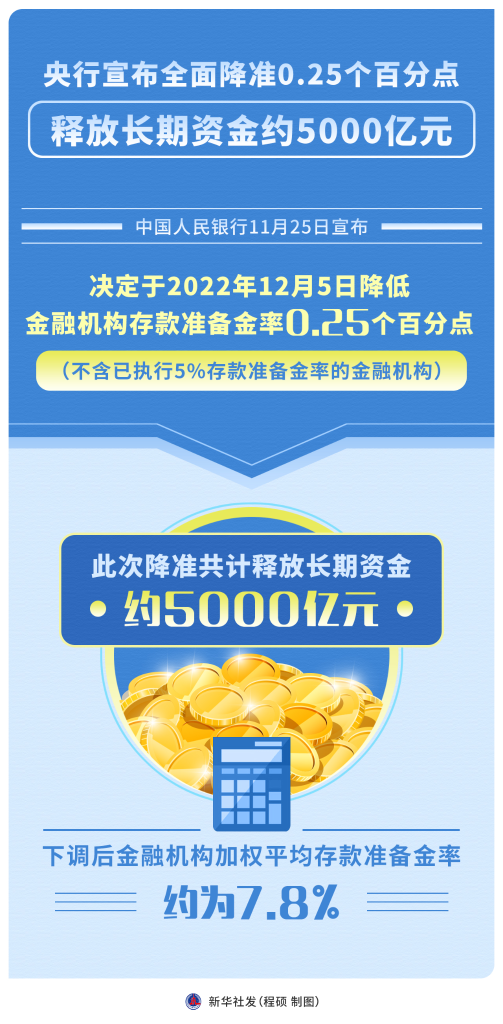 11月25日中國人民銀行宣布,決定于2022年12月5日降低金融機構(gòu)存款準備金率0.25個百分點(不含已執(zhí)行5%存款準備金率的金融機構(gòu))。這是年內(nèi)第二次降準,今年首次降準已在4月落地。兩次降準共降低金融機構(gòu)存款準備金率0.5個百分點、釋放長期資金超萬億元,金融機構(gòu)加權(quán)平均存款準備金率降至約7.8%。
