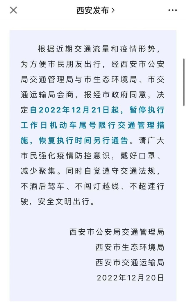 12月20日,陜西西安多部門(mén)發(fā)布通知,根據(jù)近期交通流量和疫情形勢(shì),為方便市民朋友出行,決定自2022年12月21日起,暫停執(zhí)行工作日機(jī)動(dòng)車(chē)尾號(hào)限行交通管理措施,恢復(fù)執(zhí)行時(shí)間另行通告。
