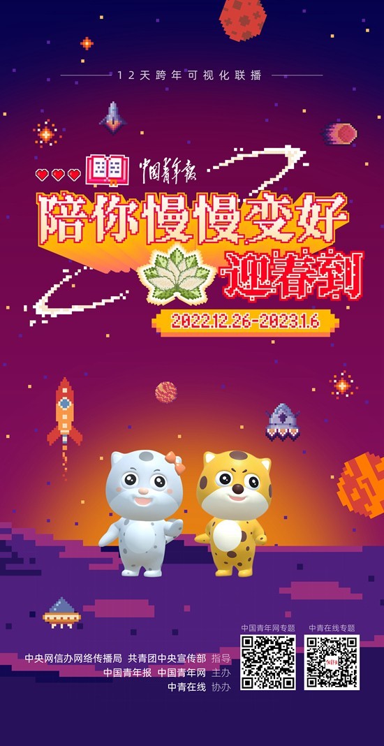本次可視化聯(lián)播活動由中央網(wǎng)信辦網(wǎng)絡(luò)傳播局、共青團中央宣傳部指導(dǎo),《中國青年報》、中國青年網(wǎng)主辦,中青在線協(xié)辦。連續(xù)12天的跨年聯(lián)播、直播,以及與之相呼應(yīng)的傳統(tǒng)紙媒形態(tài)的圖文報道、評論,新媒體形態(tài)的H5、MV、小程序,新文化業(yè)態(tài)的“青春元宇宙”融合傳播,旨在記錄不同行業(yè)年輕人的故事,關(guān)照和關(guān)愛當(dāng)下年輕人在抗疫、就業(yè)等壓力下的身心健康和成長成才,倡導(dǎo)青春上善好活法,同時探索云端思政課堂新模式,用“真”字做好黨的二十大精神的青年化闡釋。