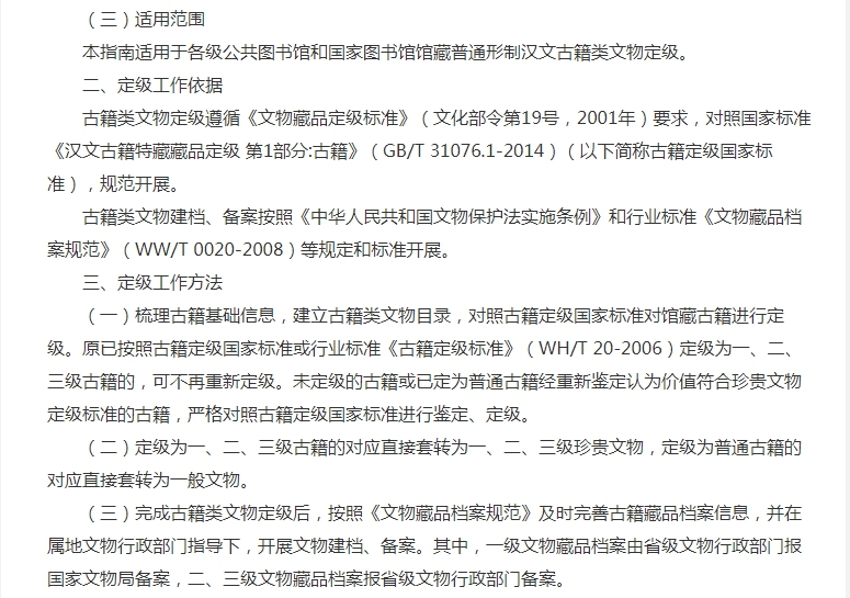 定級為一、二、三級古籍的對應直接套轉(zhuǎn)為一、二、三級珍貴文物,定級為普通古籍的對應直接套轉(zhuǎn)為一般文物。