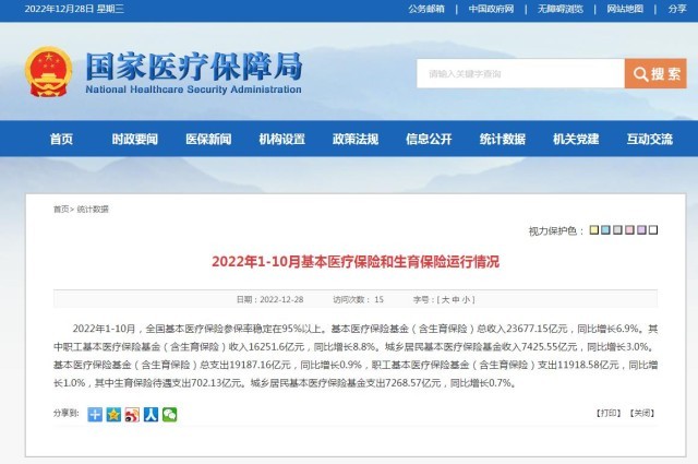 央視網(wǎng)消息:國家醫(yī)療保障局網(wǎng)站12月28日消息,2022年1-10月,全國基本醫(yī)療保險(xiǎn)參保率穩(wěn)定在95%以上?;踞t(yī)療保險(xiǎn)基金(含生育保險(xiǎn))總收入23677.15億元,同比增長6.9%。其中職工基本醫(yī)療保險(xiǎn)基金(含生育保險(xiǎn))收入16251.6億元,同比增長8.8%。城鄉(xiāng)居民基本醫(yī)療保險(xiǎn)基金收入7425.55億元,同比增長3.0%?;踞t(yī)療保險(xiǎn)基金(含生育保險(xiǎn))總支出19187.16億元,同比增長0.9%,職工基本醫(yī)療保險(xiǎn)基金(含生育保險(xiǎn))支出11918.58億元,同比增長1.0%,其中生育保險(xiǎn)待遇支出702.13億元。城鄉(xiāng)居民基本醫(yī)療保險(xiǎn)基金支出7268.57億元,同比增長0.7%。