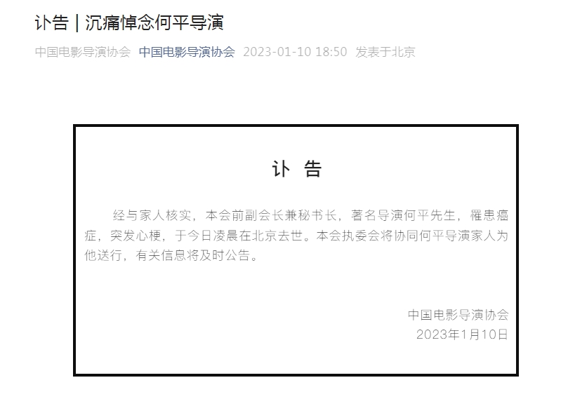 中新網(wǎng)1月10日電 據(jù)中國電影導(dǎo)演協(xié)會(huì)消息,經(jīng)與家人核實(shí),中國電影導(dǎo)演協(xié)會(huì)前副會(huì)長(zhǎng)兼秘書長(zhǎng),著名導(dǎo)演何平先生,罹患癌癥,突發(fā)心梗,于1月10日凌晨在北京去世。中國電影導(dǎo)演協(xié)會(huì)執(zhí)委會(huì)將協(xié)同何平導(dǎo)演家人為他送行,有關(guān)信息將及時(shí)公告。