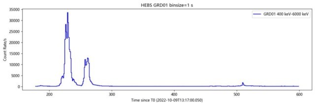 由中科院高能物理研究所研制的高能爆發(fā)探索者(HEBS)于北京時間2022年10月9日21時17分,與我國慧眼衛(wèi)星和高海拔宇宙線觀測站同時探測到迄今最亮的伽馬射線暴(編號為GRB 221009A)。根據(jù)HEBS的精確測量結(jié)果,該伽馬暴比以往人類觀測到的最亮伽馬射線暴還亮10倍以上。由于該伽馬射線暴的亮度極高,國際上絕大部分探測設(shè)備均發(fā)生了嚴重的數(shù)據(jù)飽和丟失、脈沖堆積等儀器效應(yīng),難以獲得精確測量結(jié)果。HEBS憑借創(chuàng)新的探測器設(shè)計以及新穎的高緯度觀測模式設(shè)置,探測器經(jīng)受住了高計數(shù)率的考驗,獲得了高時間分辨率的光變曲線,以及10千電子伏至5兆電子伏的寬能段能譜。HEBS極為寶貴的精確測量結(jié)果對于揭示伽馬射線暴的起源和輻射機制具有重要意義。