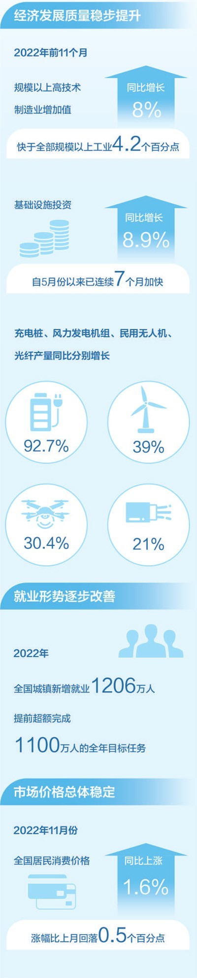2022年,面對(duì)風(fēng)高浪急的國(guó)際環(huán)境和艱巨繁重的國(guó)內(nèi)改革發(fā)展穩(wěn)定任務(wù),我國(guó)經(jīng)濟(jì)穩(wěn)健發(fā)展,全年國(guó)內(nèi)生產(chǎn)總值預(yù)計(jì)超過(guò)120萬(wàn)億元??垂┙o結(jié)構(gòu),產(chǎn)業(yè)升級(jí)發(fā)展持續(xù),新動(dòng)能積蓄增強(qiáng)。2022年前11個(gè)月,規(guī)模以上高技術(shù)制造業(yè)增加值同比增長(zhǎng)8%,快于全部規(guī)模以上工業(yè)4.2個(gè)百分點(diǎn);看消費(fèi)需求,線上消費(fèi)需求釋放帶動(dòng)作用明顯。前11個(gè)月,全國(guó)實(shí)物商品網(wǎng)上零售額同比增長(zhǎng)6.4%,網(wǎng)絡(luò)購(gòu)物帶動(dòng)快遞等行業(yè)較快增長(zhǎng)。