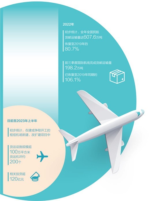 民航局有關負責人介紹,過去5年,航空貨運基礎設施建設取得積極進展,新增航空貨運能力600萬噸以上。下一步,將加強航空貨運設施規(guī)劃建設指導,初步統(tǒng)計,目前至2023年上半年在建或爭取開工的樞紐機場新建、改擴建項目中,貨運設施規(guī)模已超過100萬平方米、貨運機坪約200個,相關投資超過120億元。