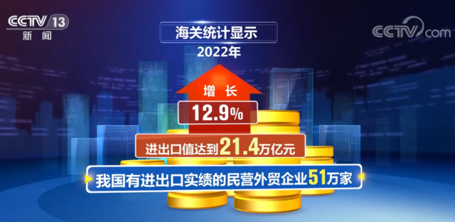 海關(guān)統(tǒng)計顯示,2022年,我國有進出口實績的民營外貿(mào)企業(yè)51萬家,進出口值達到21.4萬億元,增長12.9%。2022年,民營企業(yè)進出口規(guī)模所占比重達到了50.9%,較上年提高2.3個百分點,對我國外貿(mào)增長的貢獻率達80.8%。