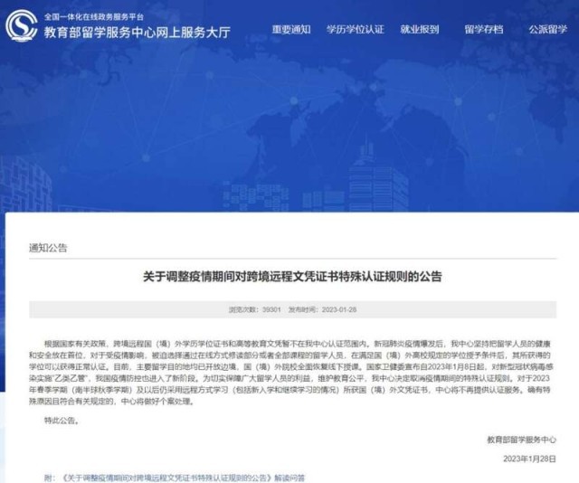 中國(guó)青年報(bào)客戶端北京1月29日電(中青報(bào)·中青網(wǎng)記者 葉雨婷)記者從教育部留學(xué)服務(wù)中心(以下簡(jiǎn)稱“中心”)官方網(wǎng)站獲悉,1月28日,中心發(fā)布《關(guān)于調(diào)整疫情期間對(duì)跨境遠(yuǎn)程文憑證書(shū)特殊認(rèn)證規(guī)則的公告》指出,對(duì)于2023年春季學(xué)期(南半球秋季學(xué)期)及以后仍采用遠(yuǎn)程方式學(xué)習(xí)(包括新入學(xué)和繼續(xù)學(xué)習(xí)的情況)所獲國(guó)(境)外文憑證書(shū),中心將不再提供認(rèn)證服務(wù)。