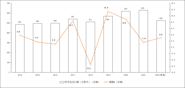 軟件業(yè)務(wù)出口保持增長。2022年,軟件業(yè)務(wù)出口524.1億美元,同比增長3.0%,增速較上年同期回落5.8個百分點。其中,軟件外包服務(wù)出口同比增長9.2%。