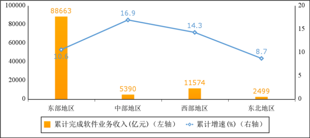 東部地區(qū)保持較快增長,中、西部地區(qū)增勢突出。2022年,東部、中部、西部和東北地區(qū)分別完成軟件業(yè)務(wù)收入88663億元、5390億元、11574億元和2499億元,分別同比增長10.6%、16.9%、14.3%和8.7%。其中,中部、西部地區(qū)高出全國平均水平5.7、3.1個百分點。四個地區(qū)軟件業(yè)務(wù)收入在全國總收入中的占比分別為82.0%、5.0%、10.7%和2.3%。