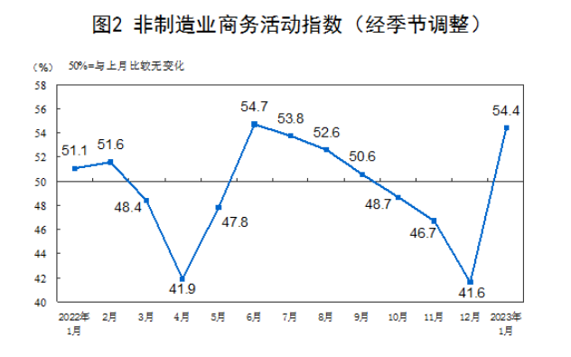 1月份,非制造業(yè)商務(wù)活動指數(shù)為54.4%,比上月上升12.8個百分點,重返擴張區(qū)間,非制造業(yè)景氣水平觸底回升。