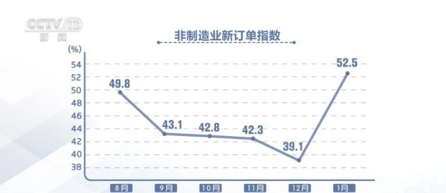 1月份中國非制造業(yè)商務活動指數(shù)為54.4%,較上月上升12.8個百分點,結束連續(xù)6個月下降走勢;新訂單指數(shù)為52.5%,較上月上升13.4個百分點,結束連續(xù)4個月下降走勢。非制造業(yè)供需呈現(xiàn)加速回升跡象。