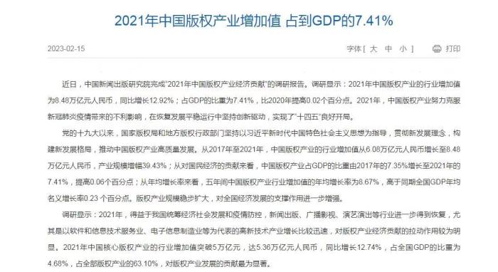 國家版權(quán)局:2021中國版權(quán)產(chǎn)業(yè)增加值占GDP7.41%