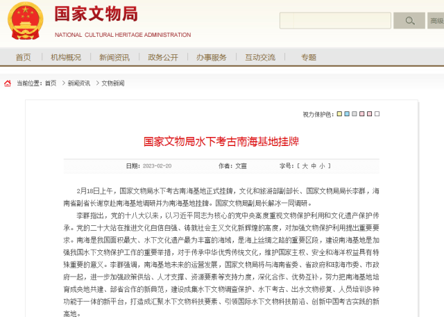 文化和旅游部副部長、國家文物局局長李群表示,南海是我國面積最大、水下文化遺產(chǎn)最為豐富的海域,是海上絲綢之路的重要區(qū)段。國家文物局將努力把南?;嘏嘤裳氲毓步?、部省合作的新典范,建設成集水下文物調(diào)查保護、水下考古、出水文物修復、人員培訓多種功能于一體的新平臺,打造成匯聚水下文物科技要素、引領世界水下文物科技前沿、創(chuàng)新中國考古實踐的新高地。