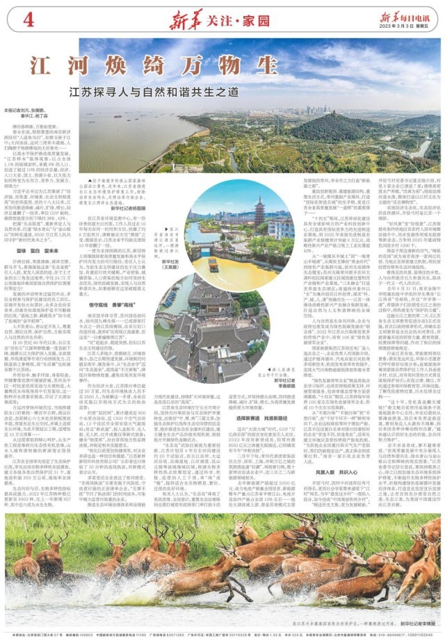 3月3日,新華每日電訊 新華關注·家園刊載題為《江河煥綺萬物生 江蘇探尋人與自然和諧共生之道》的報道。