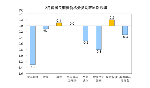 2月份,全國(guó)居民消費(fèi)價(jià)格環(huán)比下降0.5%。其中,城市下降0.5%,農(nóng)村下降0.5%;食品價(jià)格下降2.0%,非食品價(jià)格下降0.2%;消費(fèi)品價(jià)格下降0.6%,服務(wù)價(jià)格下降0.4%。