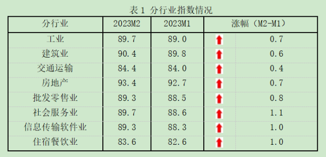 2月份,隨著經(jīng)濟(jì)逐步恢復(fù),8個行業(yè)指數(shù)均連續(xù)兩個月上升。服務(wù)業(yè)指數(shù)恢復(fù)速度領(lǐng)先,其中,社會服務(wù)業(yè)、信息傳輸計算機(jī)服務(wù)軟件業(yè)、住宿餐飲業(yè)和批發(fā)零售業(yè)指數(shù)分別上升1.1、1.0、1.0和0.8點(diǎn)。