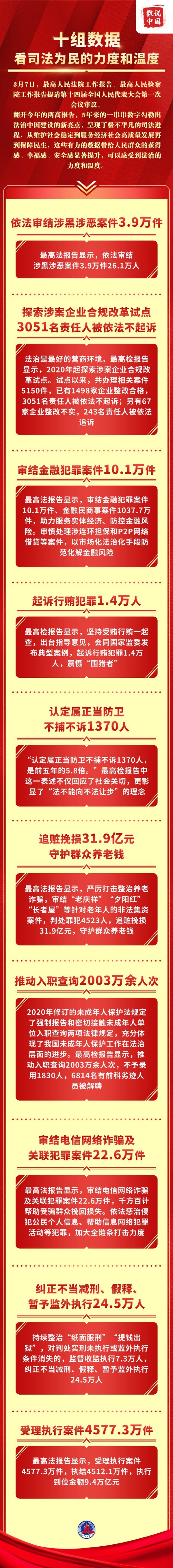 翻開(kāi)今年的兩高報(bào)告,5年來(lái)的一串串?dāng)?shù)字勾勒出法治中國(guó)建設(shè)的新亮點(diǎn),呈現(xiàn)了極不平凡的司法進(jìn)程,從維護(hù)社會(huì)穩(wěn)定到服務(wù)經(jīng)濟(jì)社會(huì)高質(zhì)量發(fā)展再到保障民生,這些有力的數(shù)據(jù)帶給人民群眾的獲得感、幸福感、安全感顯著提升,可以感受到法治的力度和溫度。