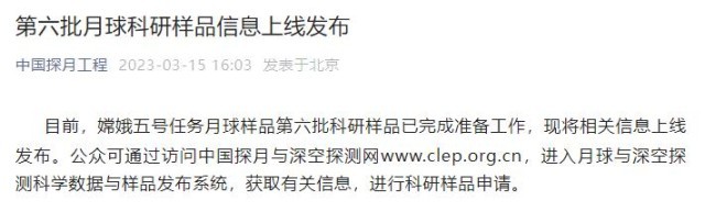 央視網(wǎng)消息:據(jù)“中國探月工程”微信公眾號(hào)消息,目前,嫦娥五號(hào)任務(wù)月球樣品第六批科研樣品已完成準(zhǔn)備工作,現(xiàn)將相關(guān)信息上線發(fā)布。公眾可通過訪問中國探月與深空探測(cè)網(wǎng)www.clep.org.cn,進(jìn)入月球與深空探測(cè)科學(xué)數(shù)據(jù)與樣品發(fā)布系統(tǒng),獲取有關(guān)信息,進(jìn)行科研樣品申請(qǐng)。