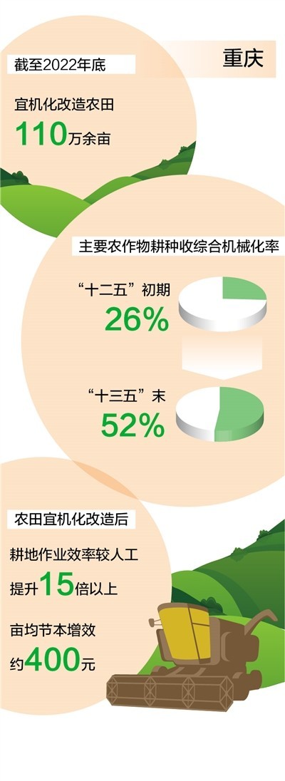 2015年起,重慶著眼于提升農(nóng)業(yè)機械化水平,探索推進丘陵山區(qū)農(nóng)田宜機化改造。截至2022年底,重慶已對110萬余畝農(nóng)田進行了宜機化改造,主要農(nóng)作物耕種收綜合機械化率由“十二五”初期的26%提高到“十三五”末的52%。